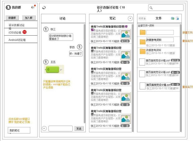 在困擾中,有道云筆記決定重頭從用戶的場景出發(fā),來定義產(chǎn)品的形態(tài)。這段時間我把電話簿、微博微信上創(chuàng)業(yè)的、帶團(tuán)隊的、做管理的、高校里做教授的好友通通騷擾了一遍,跑遍了三里屯、798、國貿(mào)、中關(guān)村、五道口的咖啡館。一番訪談下來發(fā)現(xiàn),大家要的不是一個方便的云端資料庫,更多的要是一個有效的云端工作場所。在訪談中,我的朋友們一再提起微信在他們工作中起到的重大作用,以及微信在文檔管理上的不足。有道云筆記意識到,在團(tuán)隊協(xié)作產(chǎn)品中,IM 是一個至關(guān)重要的模塊。資料庫+IM 應(yīng)當(dāng)成為協(xié)作產(chǎn)品的主要產(chǎn)品框架。