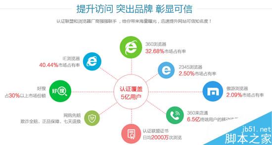 就是最近松松自己做的這個認證,上面詳細介紹過了,屬于主管互聯網業務的工信部背景,采用國家標準,正宗權威,同時有360、IE、傲游、2345 等眾多互聯網終端展示,覆蓋人群最廣,據說能覆蓋5億用戶,認證的展示效果比較好,不過據說審核標準比較嚴格。