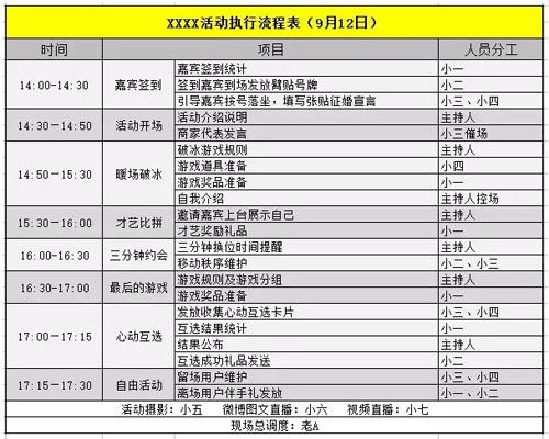 活動流程:活動流程表根據活動環節安排而定,從開始到結束每項工作分配到個人。大活動的流程復雜用到資源眾多牽涉人員很多,更需要細致,不過一般會有專門的執行人員幫忙制作,可能很多人用不到。所以這里就以50人相親的小活動為例,大家熟悉基本套路,根據自己活動有所增刪即可。