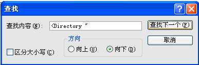 3、完成上述第2步之后,暫不要關(guān)閉httpd.conf文件,繼續(xù)查找,查找“<Directory "”(帶英文雙引號",見圖3),查找到“<Directory "”之后,將第一個“Directory”字符串后面雙引號內(nèi)的字符串修改為自己想要設(shè)定的網(wǎng)站目錄。