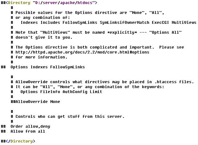 ②、找到這一行:<Directory "D:/server/apache/htdocs">,把以下這些行注釋掉,如圖: