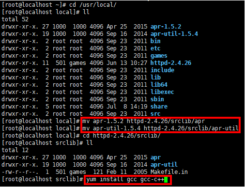 mv apr-1.5.2 httpd-2.4.26/srclib/aprmv apr-util-1.5.4 httpd-2.4.26/srclib/apr-utilyum install gcc gcc-c++
