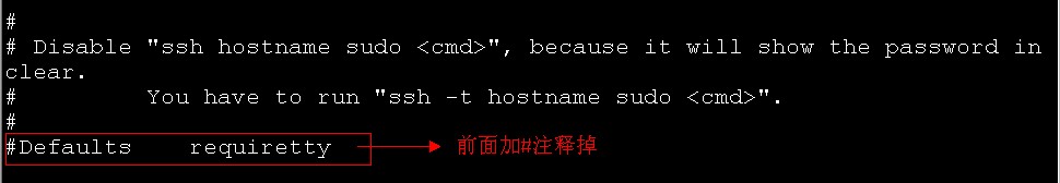 這里明顯看出,在執行sudo的時候說必須要有一個tty去運行sudo , 知道問題出在哪里問題就好解決了: vi /etc/sudoers 將下面的這句注釋掉: