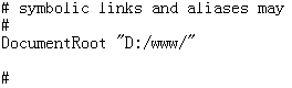 找到上圖所在位置,修改DocumentRoot后的文本,用來配置一個網站的根目錄,此處配置是為了告訴Apache你的網站根目錄在什么地方。比如我就將根目錄配置到了D盤的 www文件夾下。