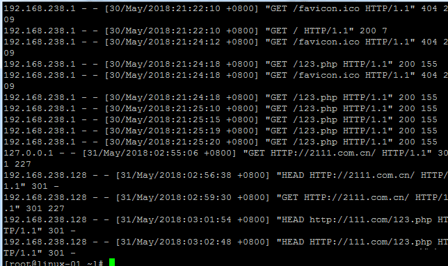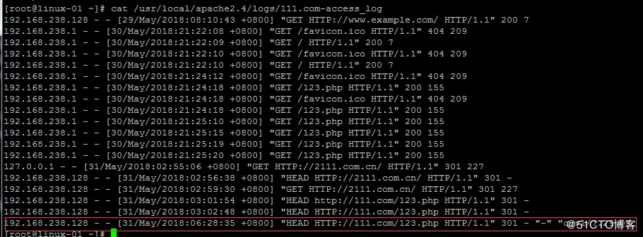 #cat /usr/local/apache2.4/logs/111.com-access_log //查看它的日志,GET為不加-I的時(shí)候,HEAD為加了-I后的只顯示狀態(tài)碼;日志詳細(xì)內(nèi)容包括:來(lái)源IP、時(shí)間、行為、訪問(wèn)的域名、http的版本、狀態(tài)碼