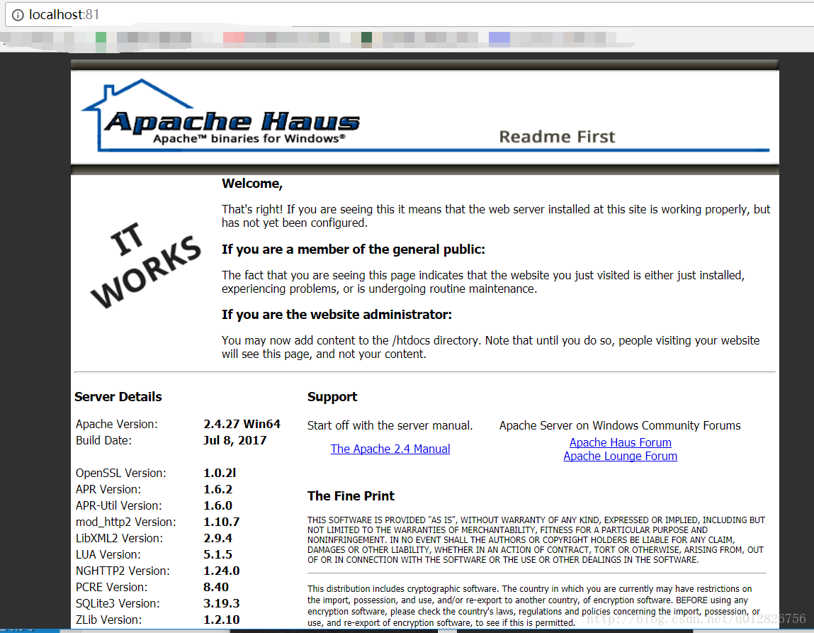 在瀏覽器里輸入localhost進(jìn)行查看,因為我的在httpd.conf修改了端口,所以需要再次輸入localhost:81訪問查看。