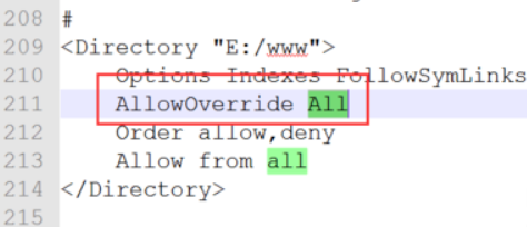 修改Directory的AllowOverride為all,注意配置文件中有很多Directory,不要該錯了,否則不會生效的,Directory一定是你apache服務的根目錄。下圖可做參考。