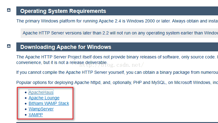 關于現在那個版本的服務器我這里要說明一下,Apache有本身的服務器是不能使用的,必須要先編譯才可以使用的。但是在他的官網上也提供了第三方編譯好的Apache所以這里我們就,下載第三方的而不用自己手動在編譯了。這里它提供了五個第三方的服務器。