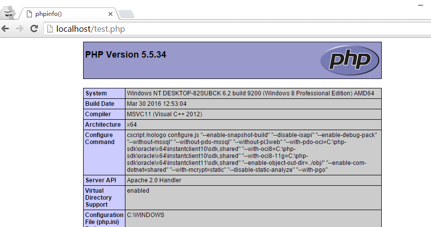 2. 在瀏覽器中打開 http://localhost/test.php ,當(dāng)出現(xiàn)如下頁面時,則表示 Apache 已經(jīng)支持 PHP 文件的解析;