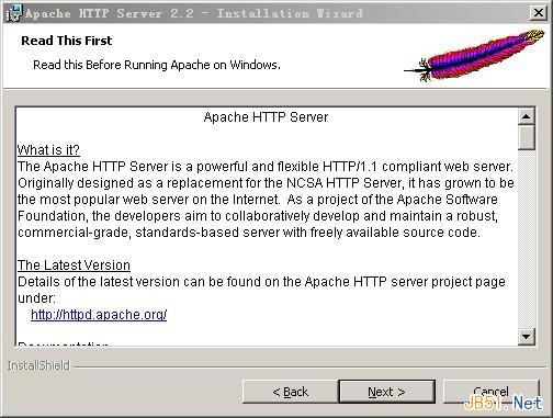 雙擊httpd-2.2.21-win32-x86-no_ssl.msi開始安裝。出現安裝歡迎界面。
