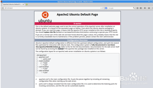 Apache 安裝完成后的默認(rèn)網(wǎng)站根目錄“/var/www/html”, 在網(wǎng)站根目錄下有一個“index.html”文件,在瀏覽器中輸入localhost或127.0.0.1,就可打開該頁面