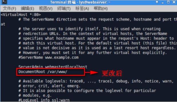 b、在終端窗口中輸入"sudo vi /etc/apache2/sites-available/000-default.conf"-->回車-->找到"DocumentRoot /var/www/html"的位置-->更改"/var/www/html"為新的根目錄就可以了,這里我把它更改為"/var/www/"。