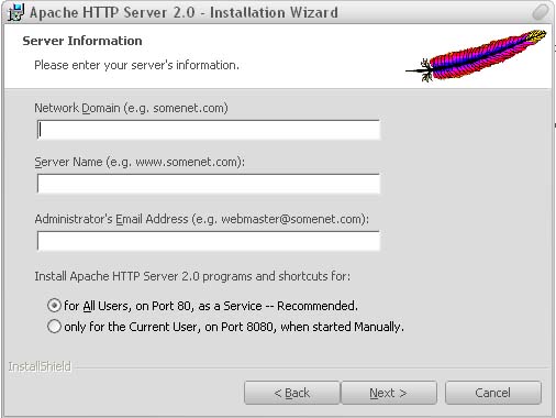 Apache的安裝非常簡單,選擇接受許可協議后進入服務器信息配置界面,如下圖。第一欄"Network Domain"域名信息,在這里填入你的服務器的域名,如果你已經申請到域名的話填入你申請的域名,(注意這里要填的是域名,只是你申請到的完整域名的后半部分,不包括"www"。如果你申請的是二級域名的話,就是第一個"."之后的部分)如果還沒有的話,把本機的IP填上去就行了。下一行是服務器名,填入完整的域名或IP地址。再下一欄是管理員Email地址。這三項在安裝是就必須填寫,但是在安裝完成后你還可以隨時進行修改,所以你不必擔心填錯了會出問題。最后的選項不用改就可以了。