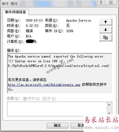 發現只有Apache服務沒有啟動。我們手工來啟動一下,系統提示錯誤。打開運行,輸入eventvwr.msc查看一下系統日志——應用程序的日志。這時候我們發現有很多錯誤,查找并打開Apache的錯誤日志,如圖2: