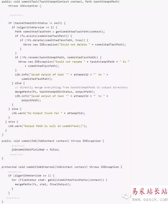 問題就出在了 Hadoop 2.x 的 FileOutputCommitter 實現FileOutputCommitter 里面有兩個值得注意的方法:commitTask 和 commitJob。在 Hadoop 2.x 的FileOutputCommitter 實現里面,mapreduce.fileoutputcommitter.algorithm.version 參數控制著 commitTask 和 commitJob 的工作方式。具體代碼如下(為了說明方便,我去掉了無關緊要的語句,完整代碼可以參見 FileOutputCommitter.java):