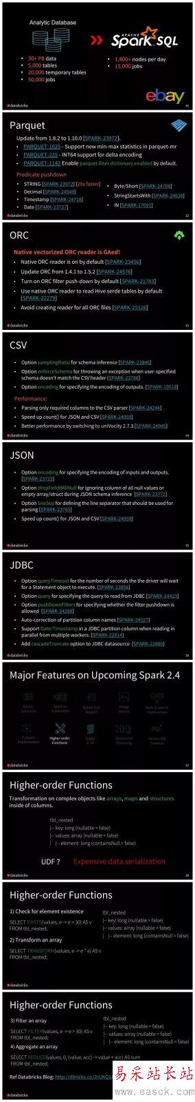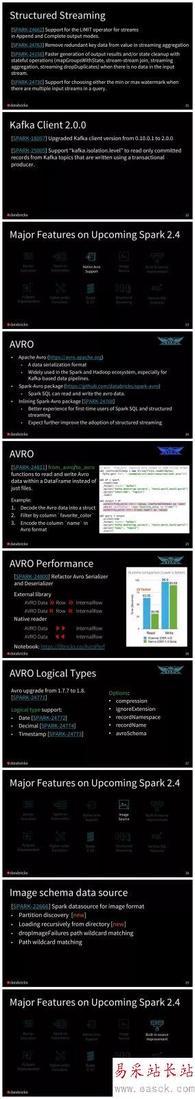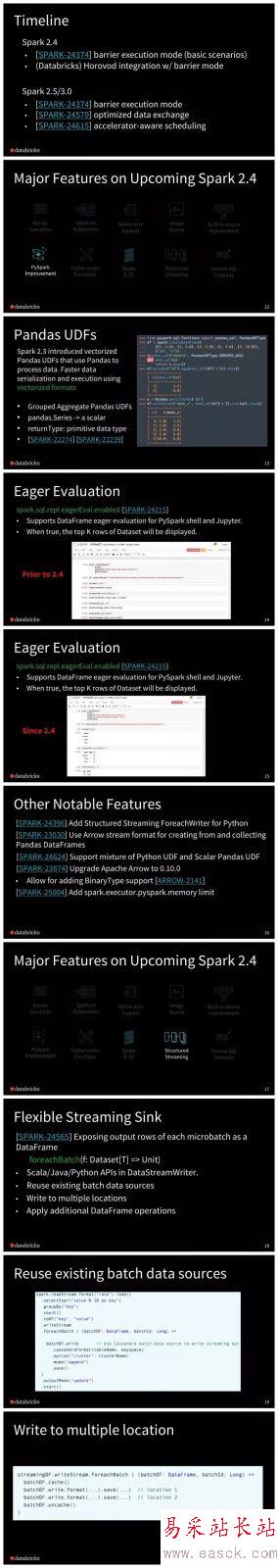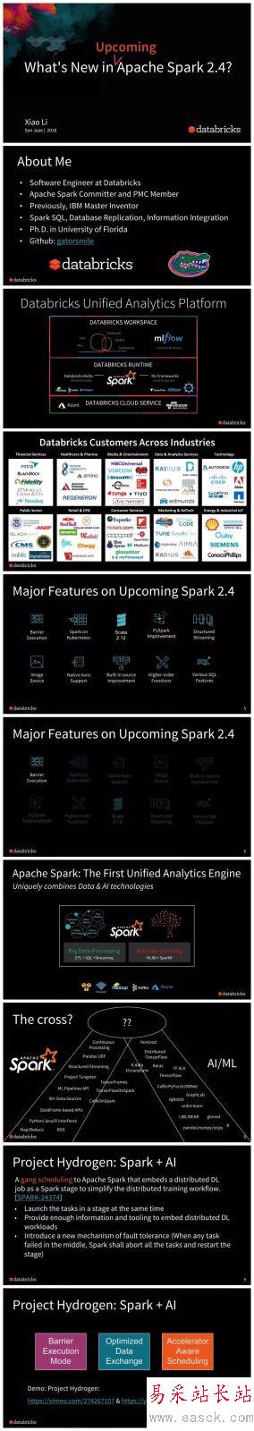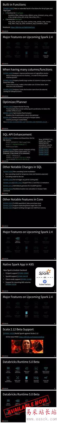 新的調度模型(Barrier Scheduling),使用戶能夠將分布式深度學習訓練恰當地嵌入到 Spark 的 stage 中,以簡化分布式訓練工作流程。 添加了35個高階函數,用于在 Spark SQL 中操作數組/map。 新增一個新的基于 Databricks 的 spark-avro 模塊的原生 AVRO 數據源。 PySpark 還為教學和可調試性的所有操作引入了熱切的評估模式(eager evaluation mode)。 Spark on K8S 支持 PySpark 和 R ,支持客戶端模式(client-mode)。 Structured Streaming 的各種增強功能。 例如,連續處理(continuous processing)中的有狀態操作符。 內置數據源的各種性能改進。 例如,Parquet 嵌套模式修剪(schema pruning)。 支持 Scala 2.12。點擊 示說網 ,即可下載此PPT。