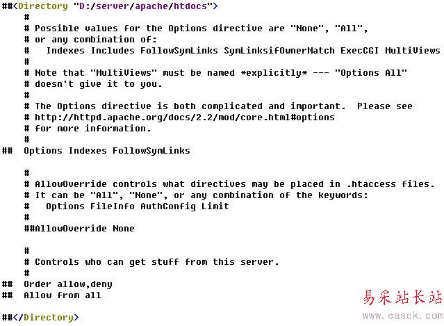 ②、找到這一行:<Directory "D:/server/apache/htdocs">,把以下這些行注釋掉,如圖: