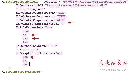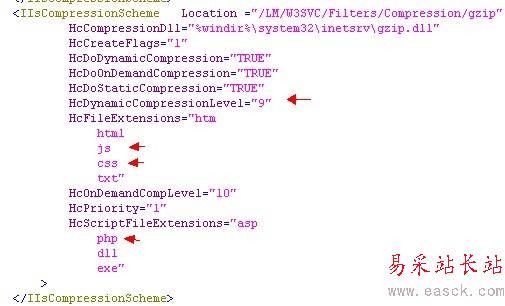 文件路徑:“c:/windows/system32/inetsrv/”(請(qǐng)先備份至他處),打開(kāi)后搜索“HcDynamicCompressionLevel”,并修改(確定已備份)“Compression/deflate”和“Compression/gzip”兩個(gè)片段的內(nèi)容。下面的圖n和圖b所修改的內(nèi)容用意是將js、css和php加入到壓縮的范疇,數(shù)字9代表壓縮等級(jí)。