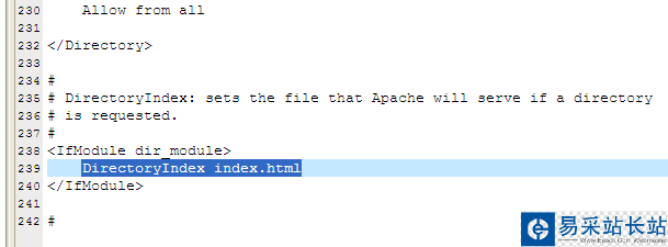 查找關鍵字,DirectoryIndex(目錄索引,也就是在僅指定目錄的情況下,默認顯示的文件名),可以添加很多,系統會根據從左至右的順序來優先顯示,以單個半角空格隔開,比如有些網站的首頁是index.htm,就在光標那里加上“index.htm”文件名是任意的,不一定非得“index.html”,比如“test.php”等,都可以。