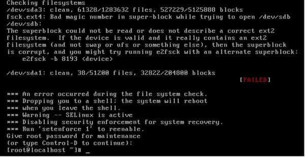我們又看到了系統(tǒng)提示符,趕快把 /etc/fstab 文件修改回來吧。又報(bào)錯(cuò)了,如圖 3 所示。