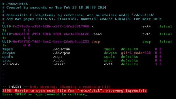 圖 3 修改 /etc/fstab 報(bào)錯(cuò)