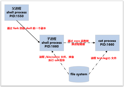 我們通過下面的例子來理解在 shell 中執行外部命令的過程,例子很簡單就是通過 cat 命令查看一個文本文件 test.log: