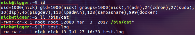 當我們在 shell 中執行一個外部程序的時候,默認情況下進程的 effective user ID 等于 real user ID,進程的 effective group ID 等于 real group ID(接下來的介紹中省略 group ID)。當我們以用戶 nick 登錄系統,并在 bash 中鍵入 cat test.log 命令并回車后。Bash 先通過 fork() 建立一個新的子進程,這個新的子進程是當前 bash 進程的一個副本。新的進程在 PATH 變量指定的路徑中搜索 cat 程序,找到 /bin/cat 程序后檢查其權限。/bin/cat 程序的所有者為 root,但是其他人具有讀和執行的權限,所以新進程可以通過 exec 函數用 cat 程序的代碼段替換當前進程中的代碼段(把 /bin/cat 程序加載到了內存中,此時的進程已經變成了 cat 進程,cat 進程會從 _start 函數開始執行)。由于 cat 進程是由用戶 nick 啟動的,所以 cat 進程的 effective user ID 是 1000(nick)。同時 cat 進程的 effective user ID 和 test.log 文件的 owner ID 相同(都是 1000),所以 cat 進程擁有對此文件的 rw- 權限,那么順理成章地就可以讀寫 test.log 文件的內容了。