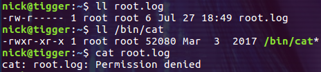 創建文件 root.log,權限為 640,此時只有 root 有權限讀寫該文件的內容,用戶 nick 連讀取該文件的權限都沒有: