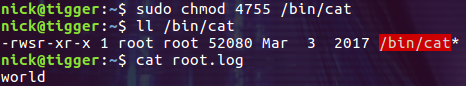 然后通過設置特殊權限 set uid ID 讓運行 cat 程序的進程具有 root 權限: