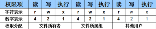 讀(read),寫(write),執行r(recute)簡寫即為(r,w,x),亦可用數字來(4,2,1)表示。
