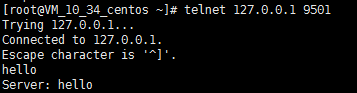使用telnet連接TCP服務,輸入hello,服務器返回hello即測試成功: