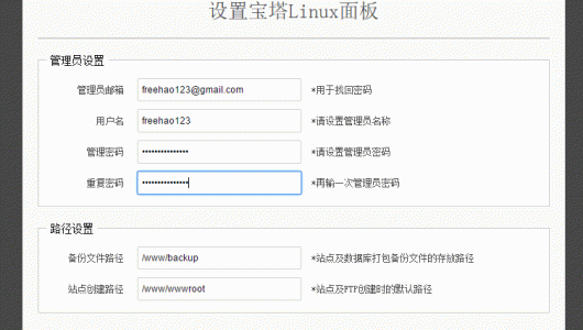 8、看到寶塔Linux面板安裝完成后,你還需要初始化寶塔Linux面板。打開:http://ip:888,然后設置好管理員賬號與密碼,確認網站備份文件路徑,點擊保存即可。(點擊放大)