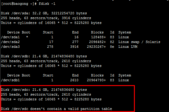 2、為該系統添加一塊新的虛擬硬盤,添加后需重啟虛擬機,否則系統不識別;如下圖,/dev/sdc 是新添加的硬盤;