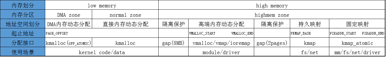 根據不同的內存使用方式和使用場景需要,內核把內存映射地址空間劃分成多個部分,每個劃分空間都有自己的起止地址、分配接口和使用場景。下圖是一個常見的32位地址空間劃分結構。