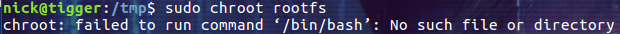這次出錯了,因為找不到 /bin/bash。我們知道 busybox 中是不包含 bash 的,但是 chroot 命令為什么會找 bash 命令呢? 原來,如果不給 chroot 指定執行的命令,默認它會執行 '${SHELL} -i',而我的系統中 ${SHELL} 為 /bin/bash。