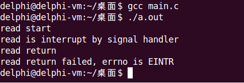 #include <stdio.h>#include <signal.h>#include <unistd.h>#include <errno.h>void handler(int s){  printf("read is interrupt by signal handler/n");  return;}int main(){  char buf[10];  int nread = 0;  signal(SIGALRM, handler);  alarm(2);  printf("read start/n");  nread = read(STDIN_FILENO, buf, sizeof(buf));  printf("read return/n");  if ((nread < 0) && (errno == EINTR))  {    printf("read return failed, errno is EINTR/n");  }  return 0;}