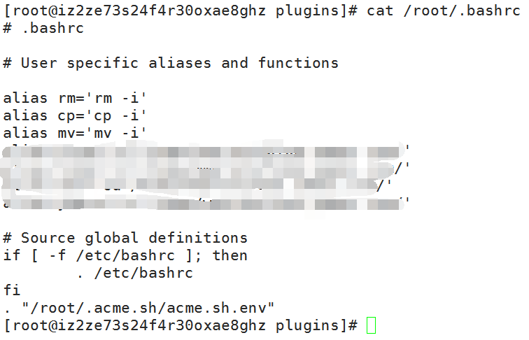 通過上圖大家可以看到里面已經有了一些 alias 的設置了,就是rm、cp、mv的,我們只需要編輯/root/.bashrc在里面添加上我們需要的別名設置保存退出即可。