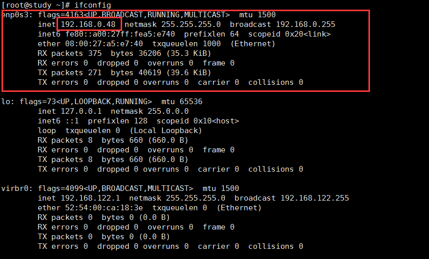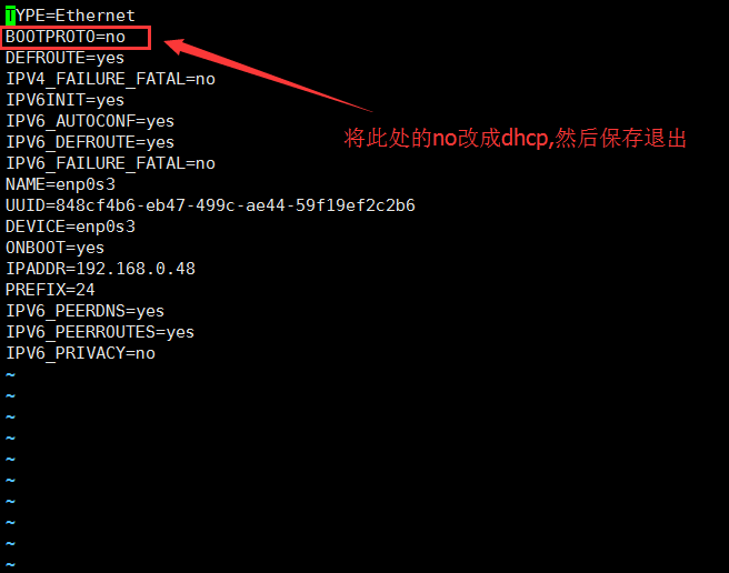 TYPE=Ethernet #網卡類型 BOOTPROTO=no #啟用地址協議 --static:靜態協議 --bootp協議 --dhcp協議 DEFROUTE=yes IPV4_FAILURE_FATAL=no IPV6INIT=yes IPV6_AUTOCONF=yes IPV6_DEFROUTE=yes IPV6_FAILURE_FATAL=no NAME=enp0s3 UUID=848cf4b6-eb47-499c-ae44-59f19ef2c2b6 DEVICE=enp0s3 #網卡接口名稱 ONBOOT=yes #系統啟動時是否自動加載 IPADDR=192.168.0.48 #網卡IP地址 PREFIX=24 /#子網掩碼24位 IPV6_PEERDNS=yes IPV6_PEERROUTES=yes IPV6_PRIVACY=no