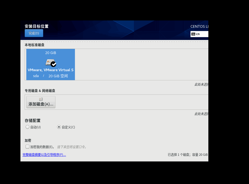 這里選中本地核準磁盤中的磁盤,然后選擇存儲配中的自定義,然后選擇左上角的完成,會顯示一個我們自定義的磁盤分配的界面,這里我們通過右下角的+號添加一個swap的分區,空間大小設置內存的2倍,我這里的是4G。