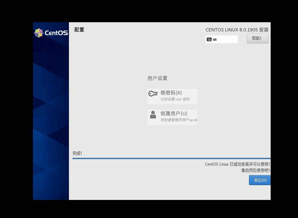 選擇根密碼可以設置root用戶的密碼(必須),選擇創建用戶可以(建議設置),最后就等待安裝結束