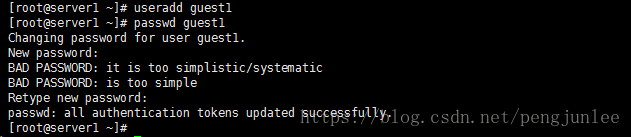 useradd guest1 //創建新用戶passwd guest1 //設置新用戶登錄密碼