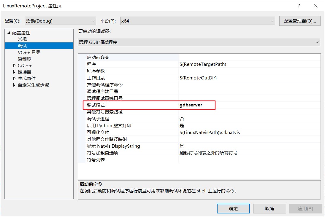 遠(yuǎn)程計(jì)算機(jī)是在調(diào)試中的遠(yuǎn)程連接管理器中添加的。這里一般不需要改動(dòng),除非你需要改變項(xiàng)目的類型或編譯結(jié)果的存放位置。如果有多個(gè)遠(yuǎn)程環(huán)境時(shí),也可以在這里進(jìn)行選擇。