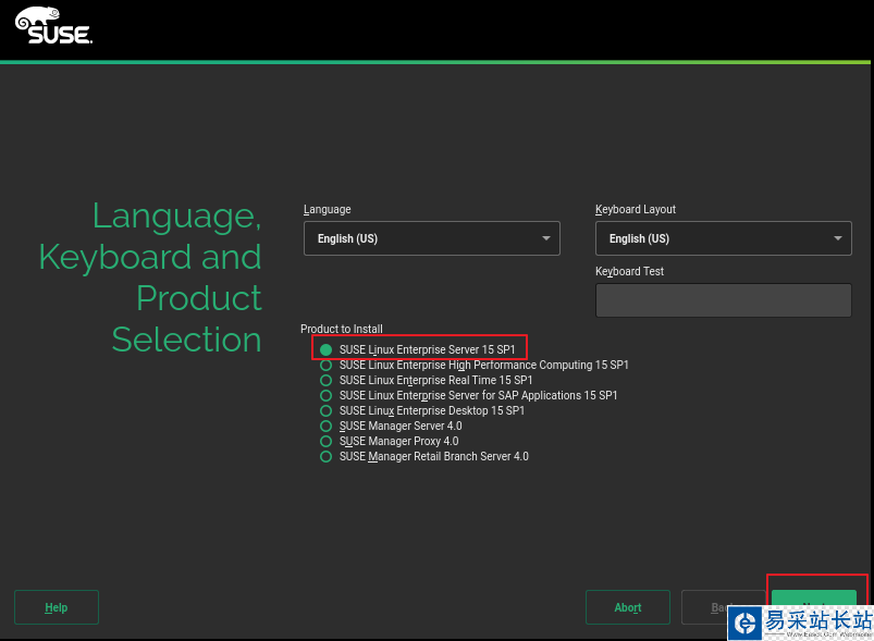 Language和KeyboardLayout都選擇為English(US),并選擇 SUSE LinuxEnterpriseServer15 SP1,然后點擊Next。