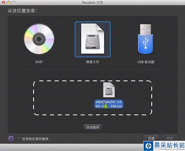 3、Parallels Desktop將自動查找本機上的系統鏡像,若未找到可通過手動查找,直接拖動鏡像到虛線框中,點擊“繼續”進入下一步。