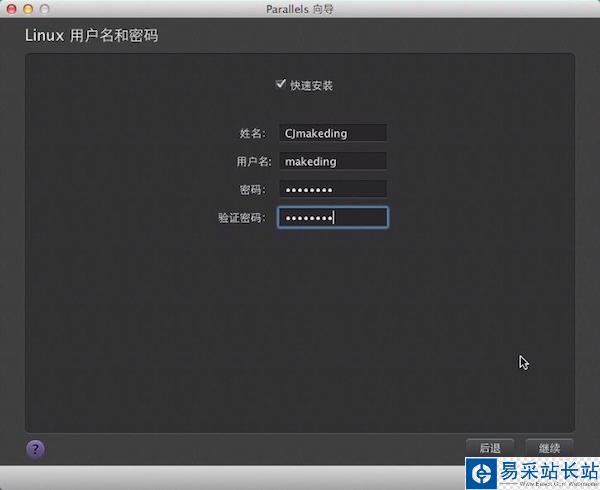 4、設定安裝的linux的用戶名和密碼,密碼需8位以上。點擊“繼續”進入下一步。設定虛擬機的名稱及位置,若要安裝多臺虛擬機,可設定“與該Mac其他用戶共享”。勾選“安裝前設定”可配置虛擬機的各種參數(安裝完可修改設定),也可以使用默認配置。