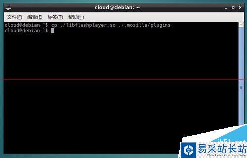 6、在終端輸入:"cp ./libflashplayer.so ./.mozilla/plugins",將插件復制到插件目錄,復制完成后重啟火狐瀏覽器。