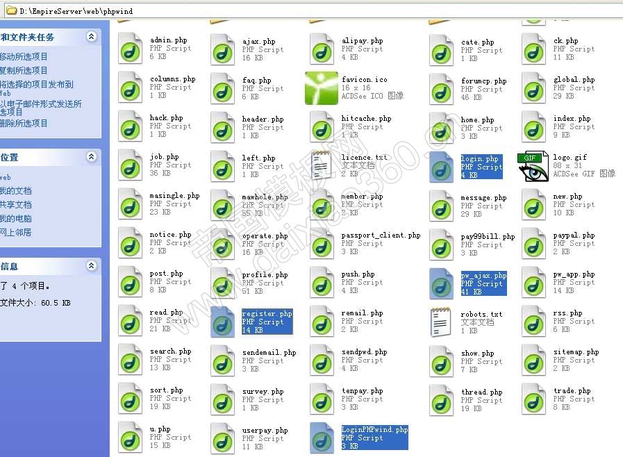 將通行證接口包里的“login.php”、“LoginPHPwind.php”、“pw_ajax.php”、“register.php”四個文件上傳到PHPwind目錄: