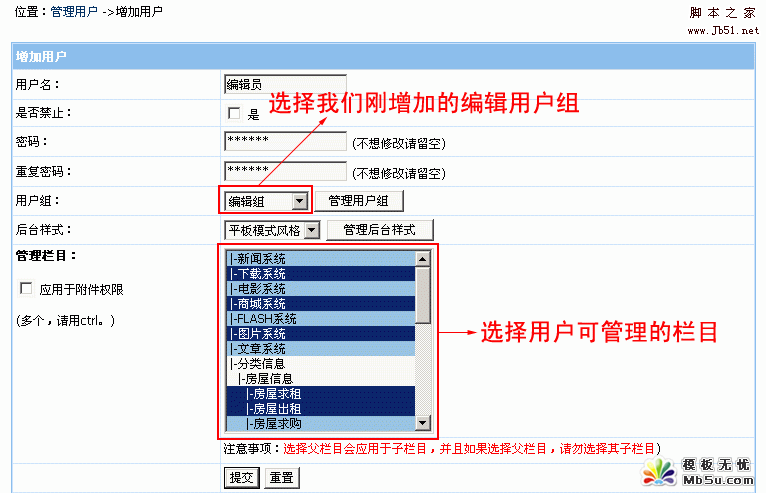 “應用于附件權限”是指將這些欄目附件的管理權限附于此用戶