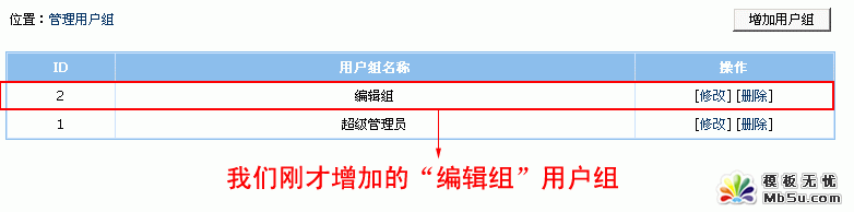2、增加用戶組后,返回管理用戶組,我們會看到剛才增加的“編輯組”用戶組,如下圖: