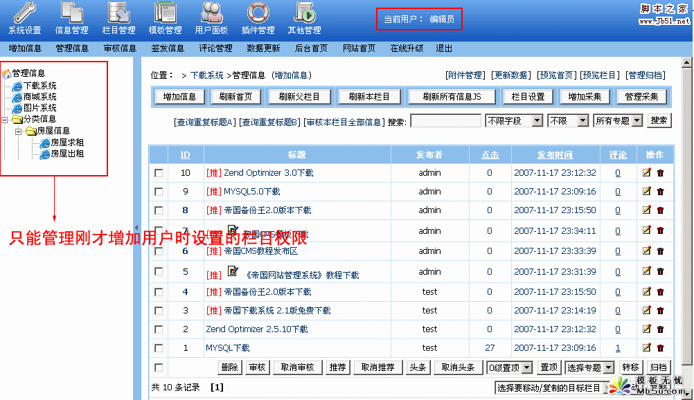 需去除“可操作所有信息欄目”,否則用戶有管理所有欄目的權限。